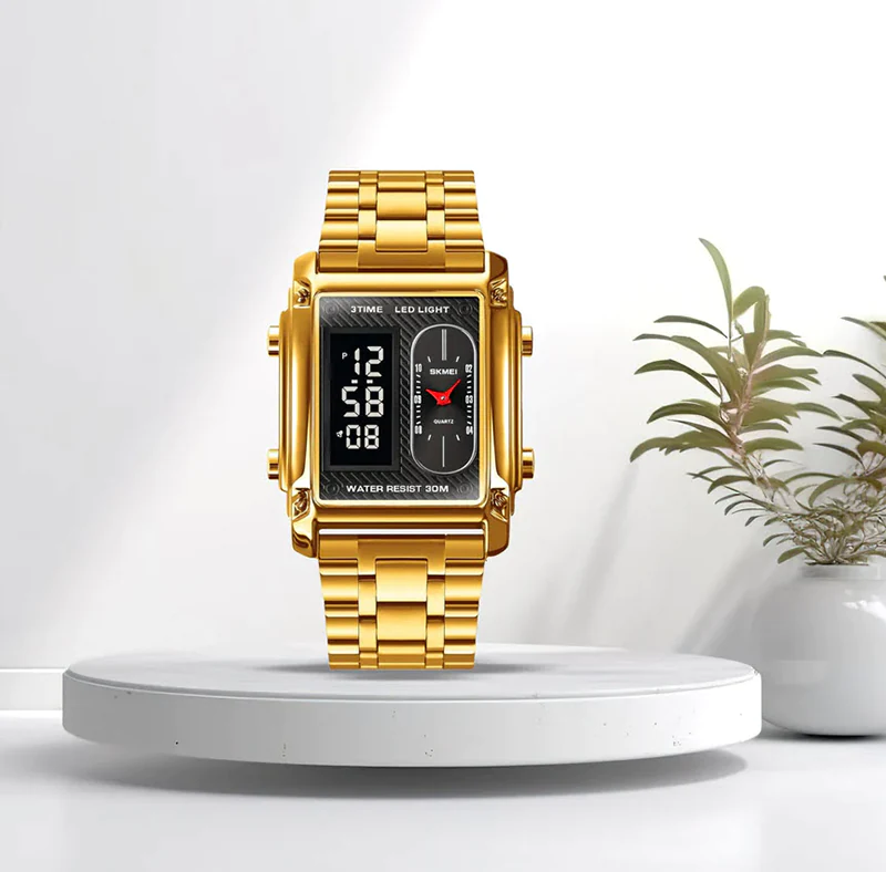 Disponible en noir, gris et doré, elle offre des finitions impeccables et des fonctionnalités pratiques pour l’homme contemporain.